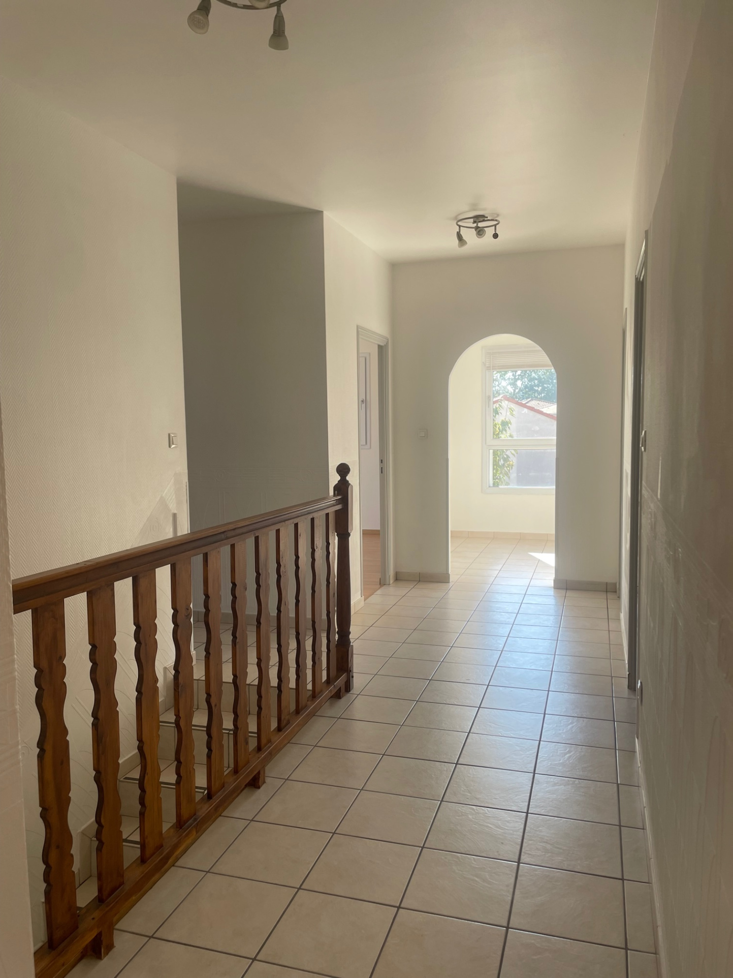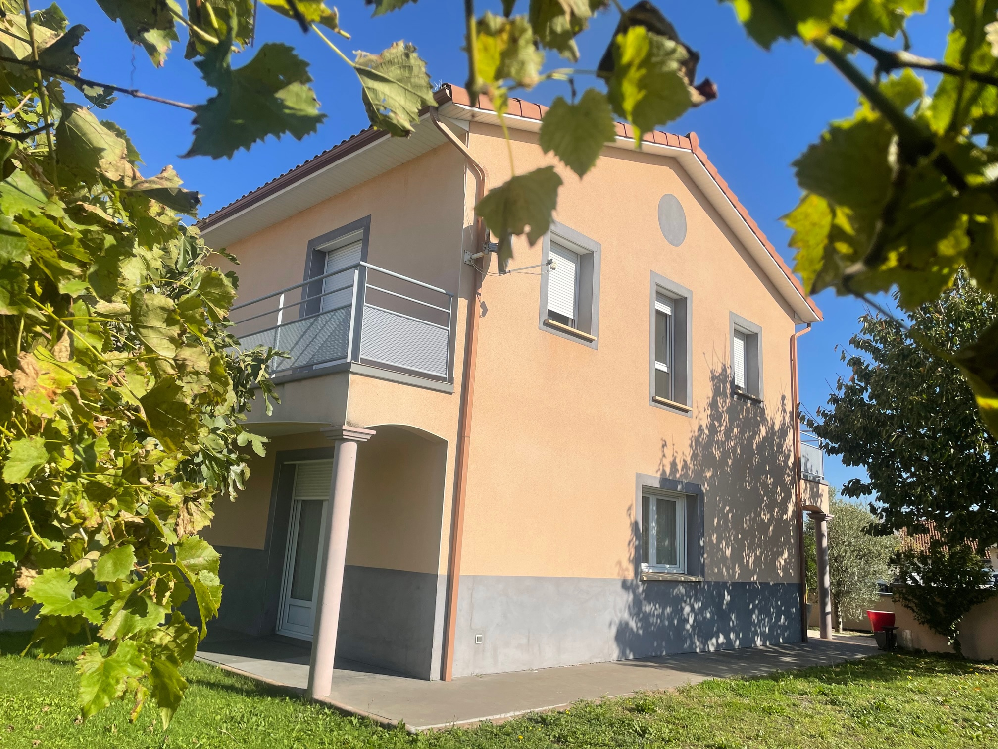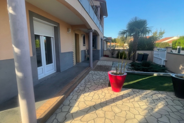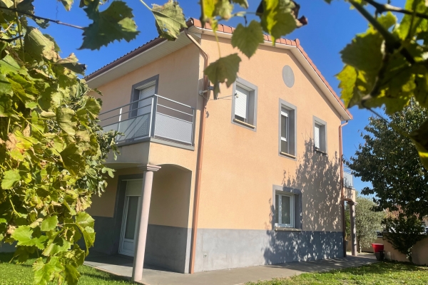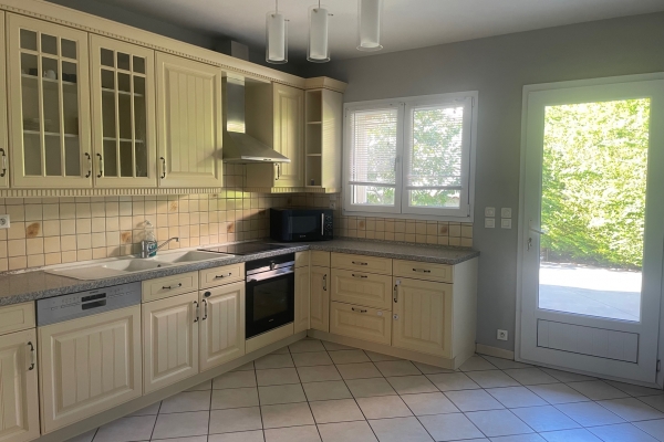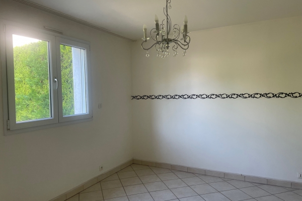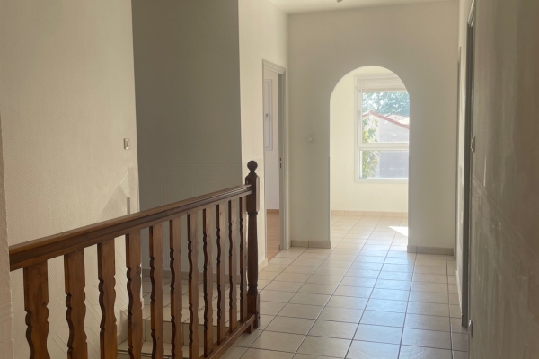 A l'étage, 4 chambres donnant sur terrasse, salle de bain, WC, menuiseries et dessous de toit en PVC, gouttières, volets roulants alu motorisés, emplacement pour 2 voitures.